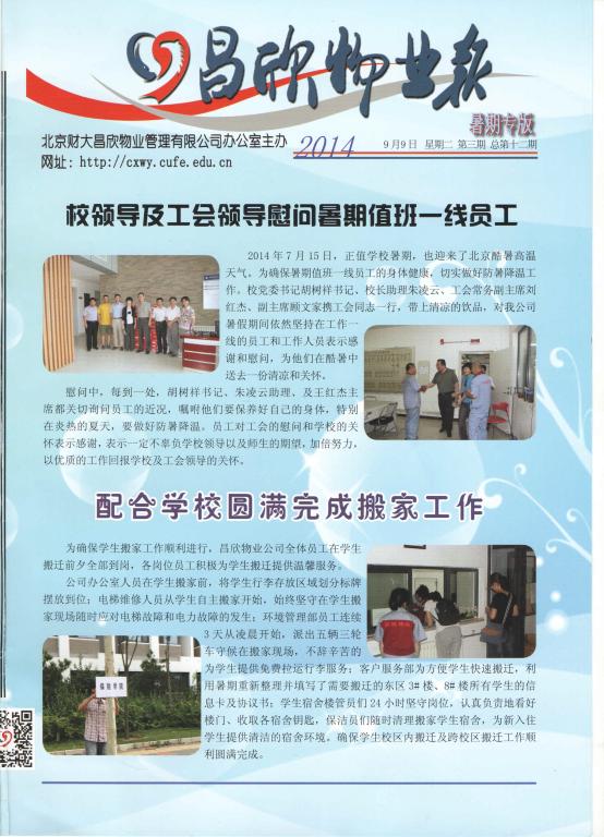 点击最新昌欣物业报由北京财大昌欣物业管理有限公司主办,旨在为学校师生提供一个了解昌欣物业的窗口,以季报的形式提供有关昌欣工作的专题动态,新闻资讯,拉近全校师生与昌欣物业公司的距离。